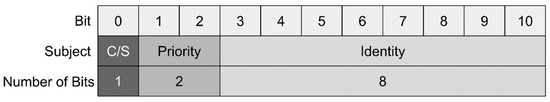 Figure 6), which allows changing the priority of messages dynamically. Therefore, the common CAN identifier (11 bits) is altered into three parts: the C/S bit, two priority bits, and an eight-bit identifier. The first bit defines if the attached CAN frame contains sensor data from a controller (C/S = 1) or command data from the operator (C/S = 0). With the next two bits, the priority of the CAN frame can be configured as urgent (00), high (01), medium (10), or low (11). As these priorities can be reconfigured for each message, critical messages can be prioritized (e.g., the priority of the message to stop the robot’s wheels can be set to urgent if an emergency stop needs to be performed). Low identifiers are prioritized over higher ones in CAN on the hardware site, meaning that command data is always handled prior to sensor data, following its personal priority. The last eight bits contain a personal identity for each actuator and sensor value of the system. As a result, a CAN frame can be transmitted to the same entity either to switch to a different mode by changing the C/S bit or to transmit the sensor data.