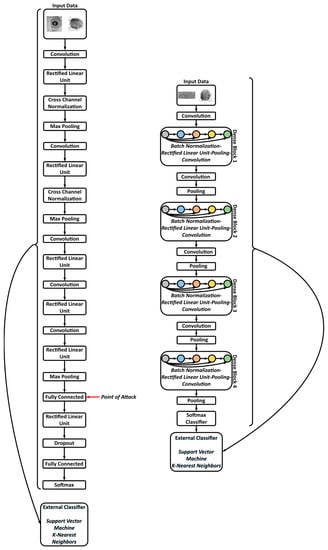 The other network utilized in this work is Dense Convolutional Network (DenseNet). This network is a stack of dense blocks followed by transition layers. According to its architecture, each layer is connected to every other layer in a feed-forward format (within each dense block). This means each layer is connected to the entire earlier layers (which provide feature re-use). Each block is made from a series of units, which each packs two convolutions, batch normalization, and ReLU activations. The output of each unit is a fixed number of feature vectors. According to this parameter, the flow of information through the layers is controlled. For each layer, the feature maps of all preceding layers are treated as separate inputs whereas its own feature maps are passed on as inputs to all subsequent layers. DenseNets have many persuading advantages namely, reducing the vanishing-gradient problem, strengthening feature propagation, encouraging feature reuse, and reducing the number of parameters substantially. This network architecture is not only efficient, but also has the big advantage of improved flow of information and gradients throughout the network. The dense connections in this network have a regularizing effect that reduces over-fitting on tasks with smaller training set sizes. Moreover, due to allowance of feature reuse among the Dense units, its structure tends to be more compact in comparison to its counterparts. The most noticeable trend in the network behavior is its easy training and higher accuracy in comparison to the other state-of-the-art networks with less number of network parameters. The architectures of these networks are shown in Figure 4. In this work a pre-trained DenseNet on the ImageNet dataset is used as a feature extractor. Moreover, AlexNet is used to demonstrate the vulnerabilities of deep neural networks against attacks.