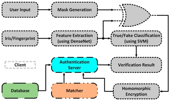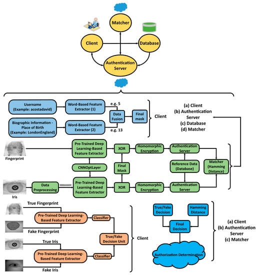 On the client-side, a person provides his/her fingerprint, iris, username, and biographic information (which is the place of birth in here). The inputted iris image is segmented in order to find the region of interest within the eye and then normalized; however, the fingerprint stays in its raw format. These images are then fed to a pre-trained deep neural network (DenseNet) and the outputs of specific layers of this network are extracted as the feature vectors for the inputs. An algorithm namely CNNOptLayer is developed to find the optimal layer for feature extraction. In parallel to this process, the username and biographic information that was gathered from the user are delivered to two word-based feature extractors. After extraction, these two word-based features, are concatenated and replicated to create a binary mask for the user. Having done so, the extracted features from the fingerprint or iris are binarized and bit-masked, and then up-sampled and encrypted using a partially homomorphic encryption scheme. On the other side, two SVM classifiers trained on the true and fake fingerprint and iris features are used to determine the type of the input biometric data in terms of being true or fake.