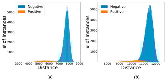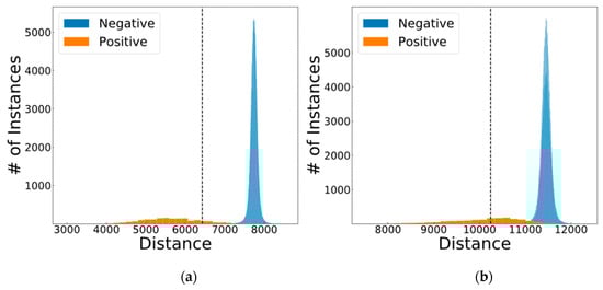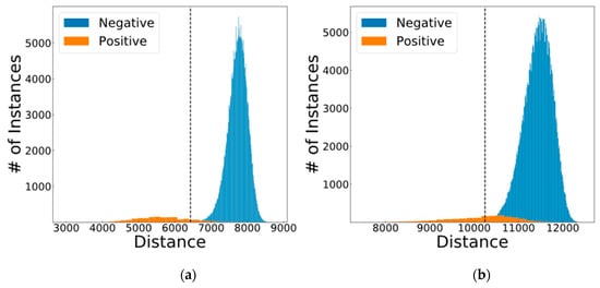 The optimum distance distributions of (a) iris and (b) fingerprint with the optimum thresholds after masking the data.