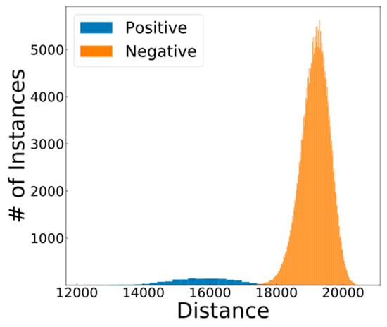 Having found the optimum layers using CNNOptLayer, we take a closer look at the results from these two layers. After the iris features are extracted from the 21th layer and fingerprint features are extracted from the 12th layer, they are binarized. Having done so, the hamming distances between all possible and unique pairs of input images are calculated. In order to do so, one image (e.g., an iris) is taken as the reference, and the rest of the images are compared to it and the hamming distances are recorded. Since there are 5 images taken from each user in the dataset, only 4 other image should ideally match this image and the 820 other users should have a higher hamming distance. In this work, the collection of the distances that are gathered from match cases are called “Positive”, while the collection of the distances that are not from the same person’s data are called “Negative”. This naming can also be thought of as their ground truth verification results. These two distributions are shown in Figure 9.