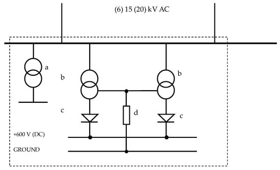 Tram traction substation—simplified functional diagram: a—transformer used for loads other than traction network, b—rectifier transformer, c—rectifiers, and d—return cables.
