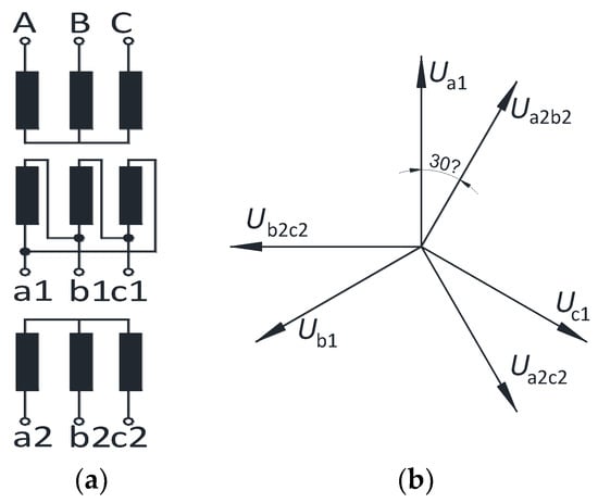 In this paper we have applied ourselves to discussing a popular and widespread 12-pulse system. This system employs a three-winding, three-phase transformer (Figure 2a). Secondary windings are configured as delta- and star-connected, respectively (this is necessary on account of eliminating magnetic flux harmonics of 3n order, and it is a standard rule followed in transformer construction [14,15]); the result is that secondary voltages are shifted in relation to each other by 30 degrees (el) (see Figure 2b). Of course, this configuration of six voltages may be achieved by other means, e.g., using two two-winding transformers. Our analysis is focused on a technical design that is quite common in practice; relatively simple; and relatively cheap, since such 6-phase transformers are batch-manufactured.