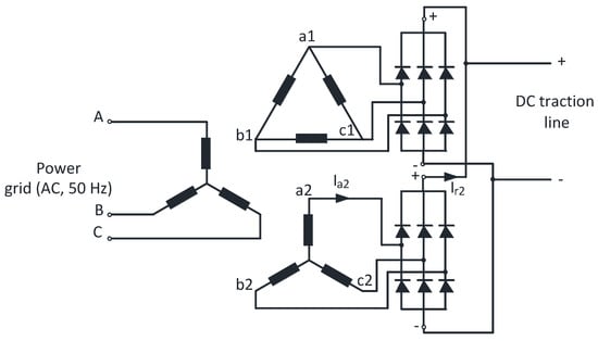Transformer’s secondary windings are connected to uncontrolled rectifiers, each consisting of six diodes. The rectifiers in tram supply are connected in parallel—see Figure 3.