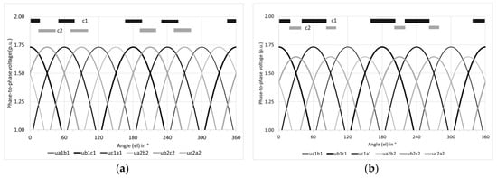 Transformer voltages: secondary side phase-to-phase voltages are marked with in black and grey; each colour corresponds to one winding: (a) star and delta winding voltages (phase-to-phase) are exactly the same and (b) star and delta winding voltages (phase-to-phase) are slightly different (UD = 0.95UY, where UD, UY—RMS-values of phase-to-phase delta and star winding voltages, respectively); conducting times of corresponding phases (c1 and c2) in both secondary windings are also shown. Supply voltage is sinusoidal.