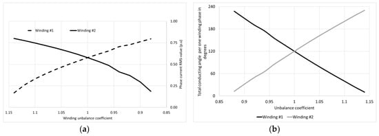This effect is due to change in diode conducting times, and, consequently, different durations of transformer winding phase conduction. We assume that output load current is of constant value (this is a usual and justified assumption for DC traction systems). Under ideal conditions, each phase conducts current for 1/3 of total fundamental frequency period; this corresponds to 120 degrees (electrical) of the fundamental sine wave. When windings are unbalanced, one winding will conduct current for a longer time and the other for a shorter time. This effect may be clearly observed in Figure 4b. The dependence of diode conducting times and winding phase current (RMS-value) on the winding unbalance coefficient is shown in Figure 5a,b.