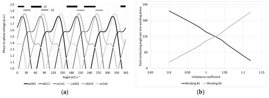 Operation in case of balanced windings and distorted supply voltage (RMS values U5 = 0.06 U1, U7 = 0.05 U1; phase shifts are φ5 = 180° and φ7 = 180°); (a) secondary voltages (phase-to-phase), black and grey lines denote star and delta-connected windings, respectively; conducting times of corresponding phases (c1 and c2) in both secondary windings are also shown; (b) total conduction angles in both windings vs. unbalance coefficient.