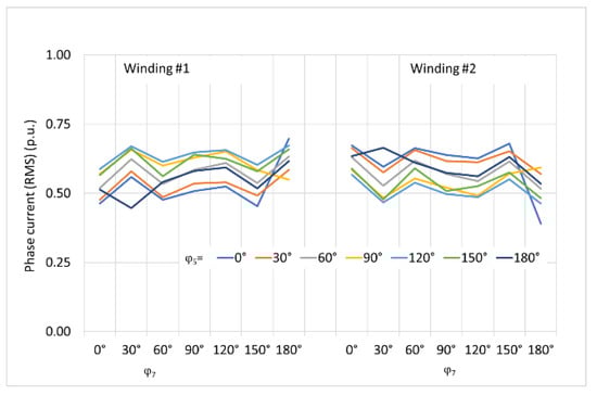 The analysis will focus on distorted supply case as defined earlier (RMS values for 5th and 7th harmonic are U5 = 0.06 U1 and U7 = 0.05 U1). The phase shifts for higher harmonics may range from 0° to 180°. In accordance with relationships discussed in the previous section, it is obvious that loading of star- and delta-connected windings will depend on the phase shifts—see Figure 7.