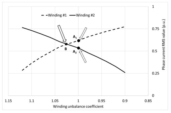 Counteracting the unbalance of phase currents in secondary windings; supply voltage is deformed, RMS-values of 5th and 7th harmonic are U5 = 0.06 U1 and U7 = 0.05 U1, phase shifts are φ5 = 180° and φ7 = 180°; points A1 and A2 mark currents’ divergence in case of balanced windings; point B marks equal loading of windings, when number of turns of one winding is changed by application of tap changer (unbalance coefficient ≈ 1.025).