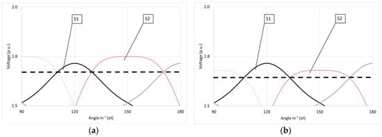 Compensation principle for reducing voltage ripple in DC voltage: black and red lines mark the voltage of star-and delta-connected windings, respectively; (a) areas S1 and S2 differ; (b) gain coefficients have been introduced, number of turns has been slightly changed, and areas S1 and S2 are similar. Thick dashed line marks voltage ripple minimum value.