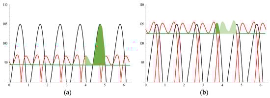 Single example of tap-changer correction of turn (voltage) unbalance of secondary windings in 6-phase rectifier transformer: black/red lines denote voltages of two secondary windings (after rectification—tops of pulses are shown); supply voltage is distorted as described in the text (THD = 7.81%, φ5 = 5°, φ7 = 110°; (a) before correction, i.e., gain coefficient ka, kb, kc is 1; (b) gain coefficient is corrected in accordance with ACO and is equal to 1.08747. Green line marks minimum ripple voltage (uphmin), and light and dark green areas correspond to S1 and S2 areas explained in Figure 9.