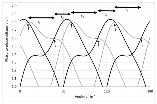 where uDCmax and uDCmin are maximum and minimum values of the pulsating rectified voltage (cf. Figure 4b: the peaks of phase-to-phase voltages marked in black /these correspond to first secondary winding are equal to uDCmax, while the intersection points between voltages of first and second winding—known as points of natural commutation—correspond to uDCmin.