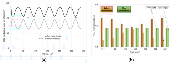 Optimization results: (a) total conducting time per phase before (solid lines) and after optimization (dashed lines); (b) winding phase current before (brown shades) and after optimization (green shades); supply voltage is distorted (RMS-values of 5th and 7th harmonic are U5 = 0.06 U1 and U7 = 0.05 U1); phase shift of 5th harmonic is φ5 = 0°; in each 4-column set, columns 1 and 3 refer to one secondary winding and columns 2 and 4 to the other secondary winding.