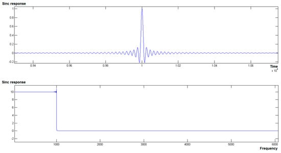 The shape of the sinc filter in the spatial domain against its shape in the frequency domain is shown in Figure 2. We note that an ideal low-pass filter cannot be obtained, since the sinc function has infinite support. One can observe the ripples around the cutoff frequency of the frequency domain of the aforementioned plot; from these, one can deduce that even though a large support was indeed employed when writing the sinc function [−1000, 1000] with a sampling rate of 0.1, one cannot ensure ideal low-pass filtering for this design.