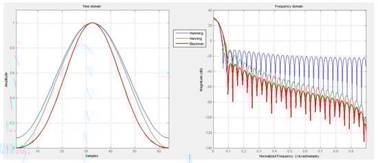 The most common windows employed in the field of finite impulse response filter design are the Hamming, the Blackman, and the Hanning windows. Many other windowing functions exist; they are described in Section 3. However, in Figure 3, we propose a comparison between a Hamming, a Hanning, and a Blackman window: