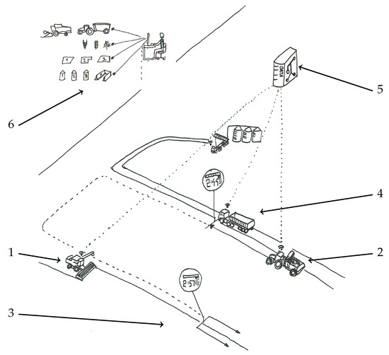 An artist’s impression of the envisioned logistics system. The off-line simulation tool is indicated by arrow 6, and depicts a farmer using the tool to setup the harvest. The harvest setup is then used by the real-time guidance system (pointed by arrow 5) to orchestrate the vehicles (pointed by 1, 2, and 4). The orchestration involves the issuing routes to be followed by the drivers and the prescription of the unload points (pointed by 3).