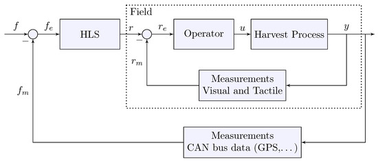 The vehicle operator (the human-in-the-loop element) steers the vehicle to follow the route r and changes the state of the field and its position y through its output u. In the best-case scenario the operator is attempting to minimise the error between the operator measurement of the current vehicle trajectory and the expected route r. It was a requirement of our project that the HLS must be able to operate without relying on additional sensors to measure the field status y. The measurements rely on the sensor information already available from the CAN bus, from which we obtain the measured outcomes of the expected process state.