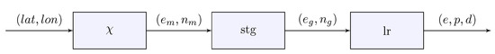 To illustrate what is meant by measuring the process state, consider the estimation of the geographical position of a combine in a field (a geolocation), which is essential in the detection of position deviations. The estimation dataflow is depicted in Figure 3. The combine is equipped with a gateway providing latitude and longitude coordinates in the form of geographic coordinates in a sphere, which traverse the network to reach the HLS prototype.