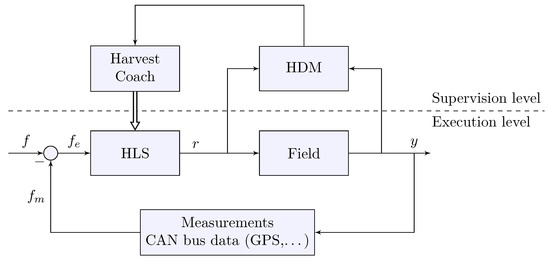 At each instant the HLS measures the available field parameters (e.g., vehicles GPS coordinates, grain intake, level of bin), computes the remainder of the field as the error , and outputs new routes by discarding the waypoints that were already reached. The diagram assumes there is only one operator in the field, but by replicating the operator box and its connections one obtains the system diagram by simple refinement.