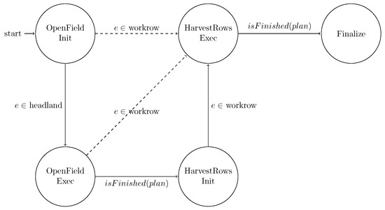 The dashed transitions of the automaton reflect the need to cope with deviations. For instance, the transition from the OpenField/Exec state to the HarvestRows/Exec if the position inferred edge e ∈ workrow is measured is one such example. Such a transition reflects the case where the open field phase of the plan is considered as finished by the driver, for instance, in case the driver becomes aware that the remainder waypoints of the plan for the open field phase do not result in yield, for instance due to the absence of crop in the corresponding patch of the field. In such situations, the driver may directly start harvesting the work rows and the automaton must skip the HarvestRows/Init state. The described abnormal transition configures a Category 2 deviation, thus causing the HC to be triggered and the deviation to be treated by among other actions discarding all non-achieved waypoints for the Open Field phase.