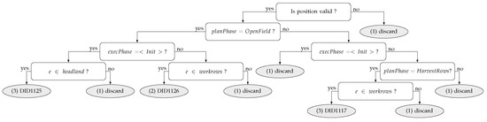 By following the graphical depiction in Figure 6 the answer sequence: triple yes, no leads to the discard node on the left bottom corner of the figure. Such path encodes our design decision regarding manoeuvring outside of the field at the harvest process start. The number in parentheses in the tree node records that our decision was that such configuration constitutes a Category 1 deviation, so the decision to be issued is to discard it. The choices shown are heuristically driven and for the purpose of testing the HCA. It must be mentioned that a thorough analysis of the different scenarios is yet to be made.