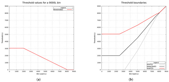Threshold plots for different bin filling scenarios. (a) The maximal threshold for each of the possible load levels of a combine with 9000 L capacity. (b) The expected, minimal, and maximal threshold values for a bin filling scenario.