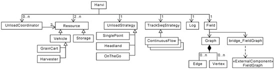 The VDM++ model supports both off-line simulation and real-time guidance of harvest operations, so it is rather complex, but in here we report on the core functionality needed to understand the deviation listings only. For a thorough description of the model, the many previous publications should suffice [4,5,6,7]. The model is object oriented, and its class diagram is shown in Figure 8. Of particular interest are the Harvi and Harvester classes. Harvi is the top-level class of the control algorithm where the stepwise/feedback control loop shown in Figure 2 is implemented by calling an operation named step, which a partial listing of its definition in found in Section 6.3.