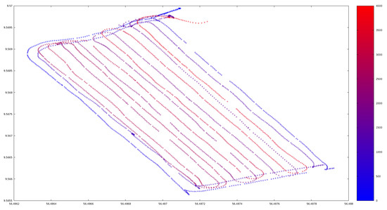Figure 9. A plot depicting the route executed by the combine in the form of position coordinates, and the colouring depicts the time dimension from the cold blue positions (at the beginning of the route) to the red hot positions (in the final part of the route). The graph represents the final test where no position deviations were triggered related to the signal discontinuities and light irregularities as shown in the plot.