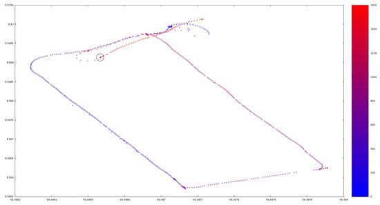Figure 10. A plot depicting a test where after a first lap in the field the combine is detected in a work row. The location where the deviation was triggered is highlighted by a circle. The plot depicts the route executed by the combine in the form of position coordinates, and the colouring depicts the time dimension from the cold blue positions (at the beginning of the route) to the red hot positions (in the final part of the route).