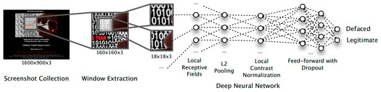 Figure 4 shows Meerkat’s architecture that is based on the deep neural network. The inputs to Meerkat are a list of web addresses (URL) of monitored pages. For each URL, the system first loads the web page and then takes a screenshot of the page. The page screenshots (images) are used as the inputs to the system instead of the original web pages for the defacement analysis and detection. Similar to other learning-based systems, Meerkat also has the training stage and the detection stage. In the training stage, it gathers screenshots of monitored web pages that are in normal working conditions. The training screenshots are processed to extract high level features using advanced machine learning methods, such as the stacked autoencoder and the deep neural network. The set of features of monitored pages are then stored in the detection profile. In the detection stage, the same processing procedure used in the training stage is applied to each monitored web page to create the current set of page features. The page’s current feature set is compared with its feature set stored in the detection profile to find the difference. If any notable difference is found an attack alarm is fired. Meerkat was tested on a dataset of 2.5 million normal web pages and 10 million defaced web pages. The tested results show that the system achieves high detection accuracies from 97.42% to 98.81% and low false positive rates from 0.54% to 1.52%. The advantages of this proposed system are that the detection profile can be constructed from the training data and the system was experimented on a large dataset. Nevertheless, this method’s main disadvantage is that it demands extensive computing resources for highly complicated image processing and recognition techniques. Moreover, Meerkat’s processing may also be slow because a web page must be fully loaded and displayed in order to take its high-quality screenshot.