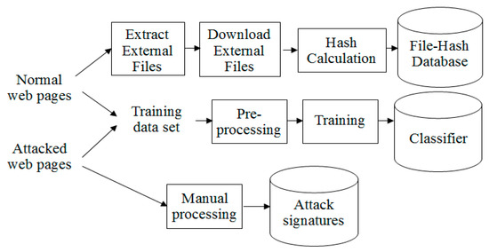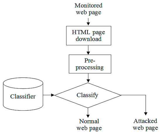 15] proposed building the website defacement detection profile by using genetic programming techniques. First, in order to collect data of web pages, they use 43 sensors for monitoring and extracting the information of monitored pages. The next step is the vectorization process, where the gathered information of each page is transformed into a vector of 1466 elements. The proposed method includes two stages of training and detection. In the training stage, web pages of normal working websites are retrieved and vectorized to construct the detection profile based on genetic programming techniques. In the detection stage, the information of the monitored web page is retrieved, vectorized, and then compared with the detection profile to look for the difference. If any significant difference is found an attack alarm is raised. The main drawbacks of this approach are that (1) it demands highly extensive computing resources for the building of the detection profile due to the large-size vectors of web pages and (2) it uses expensive genetic programming techniques.