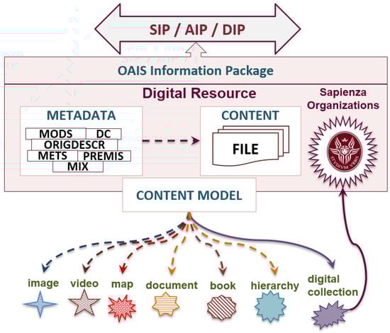 Produced XML files are associated, by URI reference, with the multimedia objects, collected by the SDL InfSys. Figure 2 shows the model of the SDL DigRes (structural model of a digital resource, managed by the Sapienza library system, https://sbs.uniroma1.it/data/documentation/DigitalResource). SDL DigRes is an information package (IP), composed by a set of data and multimedia object. IP is used for different functional roles, as defined by the Open Archival Information System (OAIS) [], respectively, submission (SIP), archival (AIP) and dissemination (DIP). By the conceptual point of view a SDL DigRes is the “simplest” set of information coherently managed by the MassConv system, it describes an intellectual entity [], collected by SDL. By the structural point of view a SDL DigRes, is at least composed by digital metadata objects (DMO), a set of data and its metadata, describing multimedia objects, that are generally defined as digital content objects (DCO). DCO is the other structural component of a DigRes. Based on the type of DCO, content models are well-defined in the MassConv system, in order to manage data and multimedia object coherently to the content type.