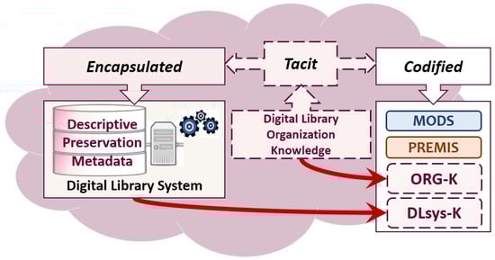 - “codified” knowledge: comprehends semantics already codified by MODS and PREMIS metadata standard (described in the Section 5) adopted by the system, and depicted as rounded boxes with a thick border. The rounded boxes, with a dashed border, represent knowledge to be codified from the “tacit” (ORG-K) and the “encapsulated” (DLsys-K).