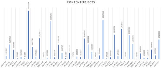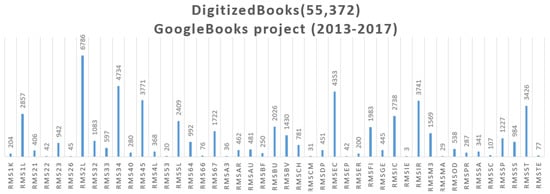 The RDB table [OrgColl]_file_objects contains data for 27,808 digitized books, containing 36,358,076* DigObjs. The star sign reminds the reader that the data is approximate, because the amount of digitized books has increased to 55,372. The correct amount of DigObjs is under computation. The histogram of Figure 6 shows the current status of OrganizationalCollection with the distribution of 48,112 DigitalResources, that have completed the second step of the MassConv workflow (see Section 6.3). The histogram of Figure 7 shows the DigitalCollection distribution of 1494 DigitalResources, that are collected, by URL reference, thus, they are a subset of the 48,112 DigitalResources, and it can be inferred that only those 1494 DigitalResources have been processed by all steps of the MassConv workflow (see Section 6.3). The histogram of Figure 8 shows the OrganizationalCollection distribution of 55,372 DigitalResources produced by the GoogleBooks digitization project, undertaken by Sapienza from 2012, until 2017. The majority of 48,112 DigitalResources were processed from GoogleBooks, and more than 1000 are still under identification process. The histogram of Figure 9 shows the OrganizationalCollection distribution of 36,358,076 ContentObjects produced by the GoogleBooks digitization project until the 2015. The actual number of the ContentObject produced by the project is a work in progress. The list of DigitalResources 48,112 and 1494, distributed over 57 DigitalCollections is reachable at the URL https://sbs.uniroma1.it/test/sapienzadl/it/itrousr-DigColl_list. The list is the access URL for the informational resource, that provide a human and machine access to the corresponding linked dataset.