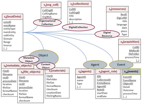 Figure 10 gives a simplified view of the MassConv-RDB schema. As a semantic data management practice, we have stored a table for the local ontology data (), and related terms have been mapped toward the relevant RDB tables, identified as the data sources for generating LD. The data source is computed by collecting processed time, stored in the tables, prefixed by [OrgColl] (see Table 1). If a data exists in a table, associated with an event, the data is computed and generated as an LD resource. For example, if we find the URI of a DigitalResource (i.e., https://sbs.uniroma1.it/openDataSets/sdl2013/METSXML/RMSAR/RMSAR_00000025.xml) in the table it means that the DigitalResourceProduction has happened for that URI, thus the data of preceding events in the workflow can be also computed. As a semantic data management practice, a simplified mapping between the data source and the ontology classes, drives also the derivation RDB tables’ relationships. The RDB relationships indeed, are not depicted, because the properties, defined by the local, and matching ontologies, will drive the LD generation, and unveil the RDB relationships, in a semantic way.