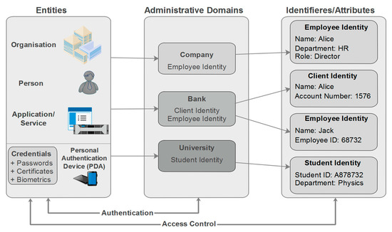 Relationship among entities, identities, and domains.