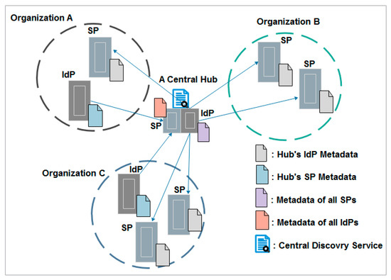 The hub-and-spoke federation with centralized login is used by organizations that do not want to establish their own IdP. In this model, there is only one central IdP that is trusted by all SPs and all local user databases are connected to this IdP, which introduces potential privacy concerns [29].