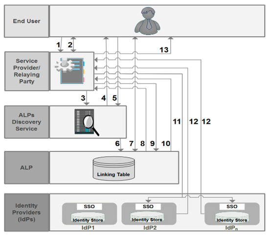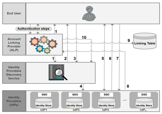 Chadwick et al. [34] developed another model by introducing a new SP called a linking service (LS). This conceptual model satisfies most of the identity management requirements and allows the collection of attributes from various sources. However, this model is difficult to deploy and maintain. It does not follow the typical conception of identity federation systems, as the first point of contact to authenticate an end user is an SP instead of an IdP. Moreover, important technical modifications should be made at SPsโ level, which could make the latter unmotivated to join systems based on this model. In addition, this model sends the total list of IdPs with end usersโ accounts, even those who manage attributes that are not requested by the SP. Thus, the second law of identity (data minimization) and the privacy requirement are not respected.