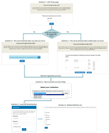 The Shibboleth software was chosen as the adopted solution to perform the technical implementations of the prototype of our proposed scheme. Shibboleth follows the SAML standard and is among the most widely deployed federated identity solutions, especially in the academic sector. Besides its larger user community and its strength, Shibboleth is built to ensure the proxy feature by handling the delegation of the end user authentication to another IdP, and then releasing the attributes to an SP via a SAML assertion once the end users have been authenticated. However, attribute aggregation from multiple IdPs in a single session is not allowed with the ordinary concept of the Shibboleth package. In other words, it could not be considered as a rely IdP. Nonetheless, and despite of its limitations, the Shibboleth package has given us a solid basis to carry out our implementations, while making appropriate changes to the base code of Shibboleth bricks, as it is an open source software. The results of the prototype implementations are represented via a series of screenshots displaying web interfaces of the proposed system. The web-based workflow of registration and accounts linking process of the proposed scheme is illustrated in Figure 10.