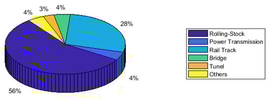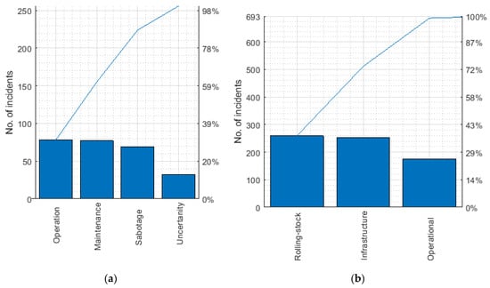 Maintenance can be defined as a task or series of tasks that protect or reinstate the anticipated condition of a system, and these tasks include technical, administrative, and managerial actions taken [1,2]. In railway industry, proper maintenance of infrastructure, rolling-stock, and other resources are vital in providing a safer, reliable, efficient, and resilient output. In Swedish railway, about 30% of all rail and track related incidents and accidents that took place between 1988 to 2000 were due to maintenance related causes [3]. Additionally, it has been revealed that among 700 accidents reported over 23 countries, 37% were due to rolling-stock faults and 36% were due to failures in infrastructure [4]. Further, by referring to Pareto graph in Figure 1a, it can be realized that maintenance contributes to most 80% of the rail and track related accidents in Sweden. In addition, by referring to the Pareto graph in Figure 1b, it is evident that rolling-stock and infrastructure faults contributed almost 80% of accidents summarized by the D-RAIL FP7 project.
