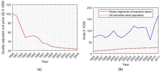 (a) Price of industrial robots over time [1] and (b) population in the United Kingdom (UK) and annual shipments of industrial robots from 1995 to 2011 [2].