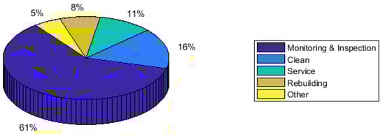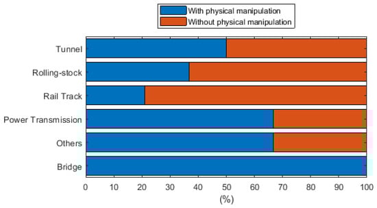 In this paper, more than 65 authentic research articles that were related to distinct research and developments of RAS in railway maintenance domain have been summarized and analysed. It has been identified that majority of examined developments are related to rolling-stock maintenance and inspection, which is about 56%. About 28% developments are related to rail-track maintenance and inspection tasks, followed by power transmission maintenance, which is around 5%. RAS in the railway bridge and tunnel maintenance accounted 4% and 3% of total developments, while other maintenance applications, such as automated condition monitoring of grade crossings and cleaning of stations and platforms accounted for 4% of the total developments—see Figure 3. Further, it has been found that the majority of RAS implemented are limited to inspection and monitoring tasks, which are about 62%. The remaining 38% of RAS perform physical manipulation—see Figure 4 for a detailed breakdown by area of application.