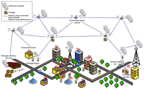 Based on the integration of 5G networks into the future smart city concept, the Internet of Vehicle (IoV) has emerged as a new research field of “vehicle-to-vehicle (V2V) communication” for the Internet of Things (IoT) [2]. The applications of IoV can be classified into two categories; (1) Safety and Management and (2) Business Oriented, as discussed by Kaiwartya et al. [3]. The Safety and Management category includes accident prevention, emergency call, real-time traffic information, parking helper, etc. The Business Oriented category includes car sharing, connected driving, car pooling, etc. In our work, we consider 5G enabled IoV for buying and delivering packages using two types of autonomous vehicles, including unmanned aerial vehicles (UAVs) and self-driving cars, as presented in Figure 1.