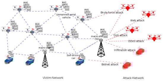 In our threat model, the macro eNBs (5G) are trustable and non-compromisable. However, we consider a global external attacker A against a blockchain-based delivery platform, which can perform the following six categories of attacks, including brute-force attacks, web attacks, Denial of Service (DoS) attacks, Distributed Denial of Service (DDoS) attacks, infiltration attacks, and Botnet attacks. These attacks are simulated in the CSE-CIC-IDS2018 dataset [17]. As presented in Figure 2, we consider two networks, including (1) Attack-Network and (2) Victim-Network.The global external attacker A is located at Attack-Network while blockchain-based delivery platform is located at Victim-Network.