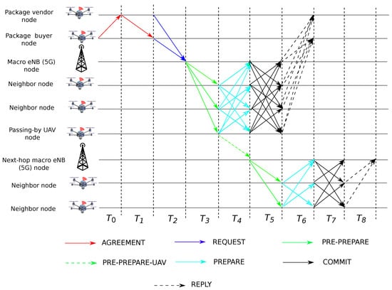 Figure 3. The consensus process for blockchain-based delivery platform, which the macro eNB (5G) node invokes UAV-aided forwarding algorithm to forward the message PRE-PREPARE-UAV to a proper next-hop macro eNB (5G) node. Let , , and , where and , be the transmission ranges of macro eNB (5G), next-hop macro eNB (5G), and UAV nodes, respectively. A passing-by UAV node in is willing to help forwarding the message PREPARE to next-hop macro eNB (5G). When the node leaves the transmission and enters in the transmission , the node sends the PRE-PREPARE-UAV message to next-hop macro eNB (5G). - Step 5. The node forward the message PRE-PREPARE-UAV to next-hop macro eNB (5G) . Then, the invokes the first steps (i.e., Step 1, Step 2, and Step 3).