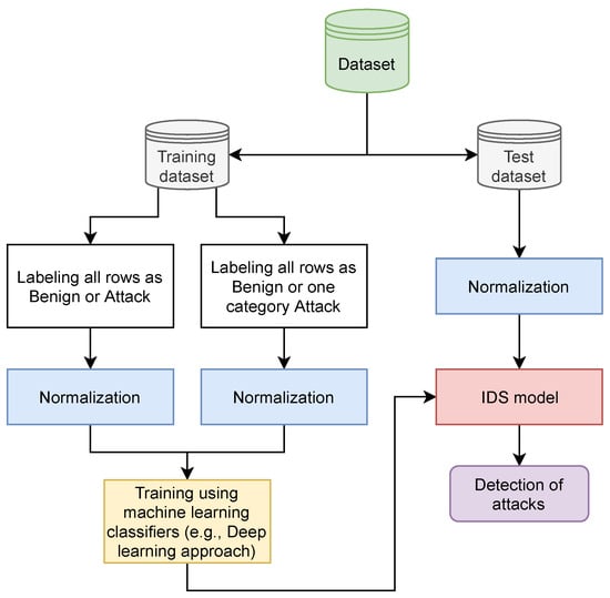 We propose an IDS system in each macro eNB (5G) for detecting network attacks and false transactions. As presented in Figure 4, the IDS system consists of five stages: (1) dataset stage, (2) pre-processing stage, (3) normalization stage, (4) training stage and (5) testing stage. The dataset stage consists of the selection of benchmark dataset which contains different attack scenarios. The pre-processing stage consists of apportioning the data set into training and test sets as well as labelling each row as an attack or benign. The normalization stage consists of normalizing the different features of the data set. The training stage consists of using machine learning classifiers (e.g., Random Forest, Learning Vector Quantization, Linear Regression, Naive Bayes, K-Nearest Neighbors, Support Vector Machines, Deep learning, ...etc.) to obtain a model. The test stage consists of processing each row of the test data using the model obtained from the training stage in order to classify as Benign or a specific type of attack.
