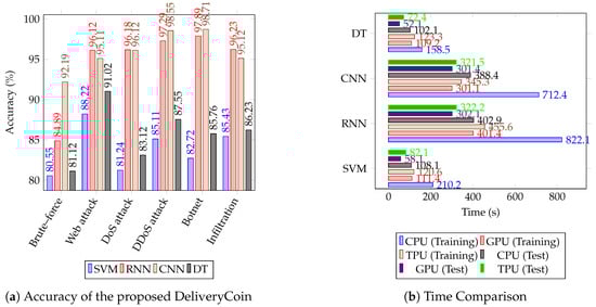 Figure 5 shows the accuracy of the proposed DeliveryCoin with different hardware accelerators and four different classification techniques, including support vector machine (SVM), recurrent neural network (RNN), convolutional neural network (CNN), and decision tree (DT). By comparing the results of the classifiers, we can see that overall CNN and RNN classifiers the effectiveness and accuracy of results are better than SVM and DT classifiers. The CNN classifier achieves the best effectiveness and accuracy in three types of attacks, including Brute force attack, DDoS attack, Botnet attack, which the achieved accuracy in these states being 92.19%, 98.55%, and 98.71%, respectively. The RNN classifier achieves the best effectiveness and accuracy in three types of attacks, including Web attack, DoS attack, and Infiltration attack, which the achieved accuracy in these states being 96.12%, 96.18%, and 96.23%, respectively. The results of the performance comparison in terms of training and test time, for the CSE-CIC-IDS2018 dataset, are shown in Figure 5b. From these results, we can see that the CNN classifier requires less training time as compared to the RNN classifier. In addition, the deep learning approaches (i.e., RNN and CNN) with graphics processing unit are recommended for use in DeliveryCoin framework where good accuracy and short training time are desired.