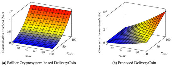 Figure 6 shows comparisons between the proposed DeliveryCoin and the Paillier Cryptosystem-based DeliveryCoin in term of communication overhead for varying number of number of UAVs and different values for reaching a consensus in the blockchain-based delivery network. In contrast to the Paillier Cryptosystem-based DeliveryCoin, we can obviously observe that the proposed DeliveryCoin is very efficient in terms of communication cost.