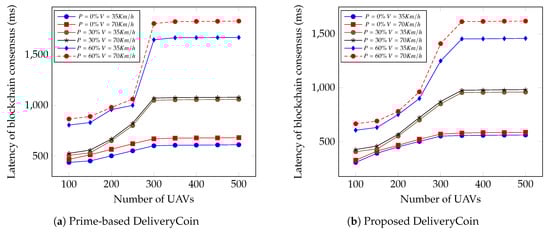 Figure 7 shows comparisons between the proposed DeliveryCoin and the Prime-based DeliveryCoin [24] in term of latency of blockchain consensus for various number of UAVs , probabilities of malicious UAV nodes , and velocities of UAV nodes V ={35 Km/h, 70 Km/h}. When , the proposed DeliveryCoin has a lower latency of blockchain consensus than the Prime-based DeliveryCoin. As the probability P increases, malicious UAV nodes can add more false transactions in order to add more delay. In Figure 7a, when , malicious UAV nodes under the Prime-based DeliveryCoin can add approximately 300 ms more delay than when . In Figure 7b, when , the malicious UAV nodes under the proposed DeliveryCoin can add approximately 200 ms more delay than when . In addition, we can see that when the number of UAVs increases, the latency of blockchain consensus begins to climb steeply due to fact that the macro eNB (5G) node invokes UAV-aided forwarding algorithm as well as updates queuing at UAV nodes more frequently.