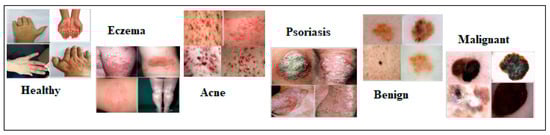 - Hameed, N.; Shabut, A.M.; Hossain, M.A. Multi-Class Skin Diseases Classification Using Deep Convolutional Neural Network and Support Vector Machine. In Proceedings of the 12th International Conference on Software, Knowledge, Information Management & Applications (SKIMA), Phnom Penh, Cambodia, 3–5 December 2018. [Google Scholar]